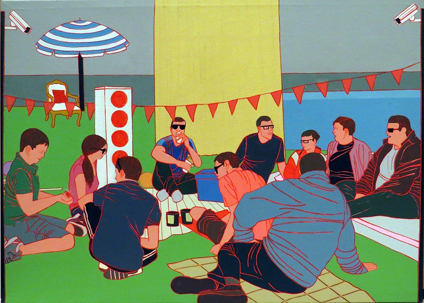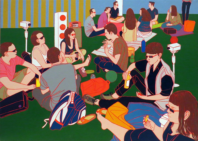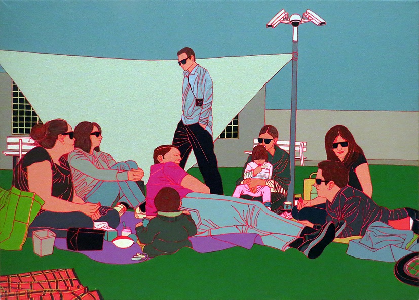 Her “grassland” landscapes are flat and confusingly utopian. Painted in fabulous, but unreal colours, the characters appear happy and engaged. Yet the use of colour, outlining them in red or aggressive florescent colours, heightens the anxiety in the pictures. Everyone is happy, but the atmosphere is tense. The cameras are there, the speakers are there, just as part of the urban landscape, the silent, never absent presence. I like to call them instruments of “control through silent presence”. It’s all very 1984 in a very 2014 kind of way.