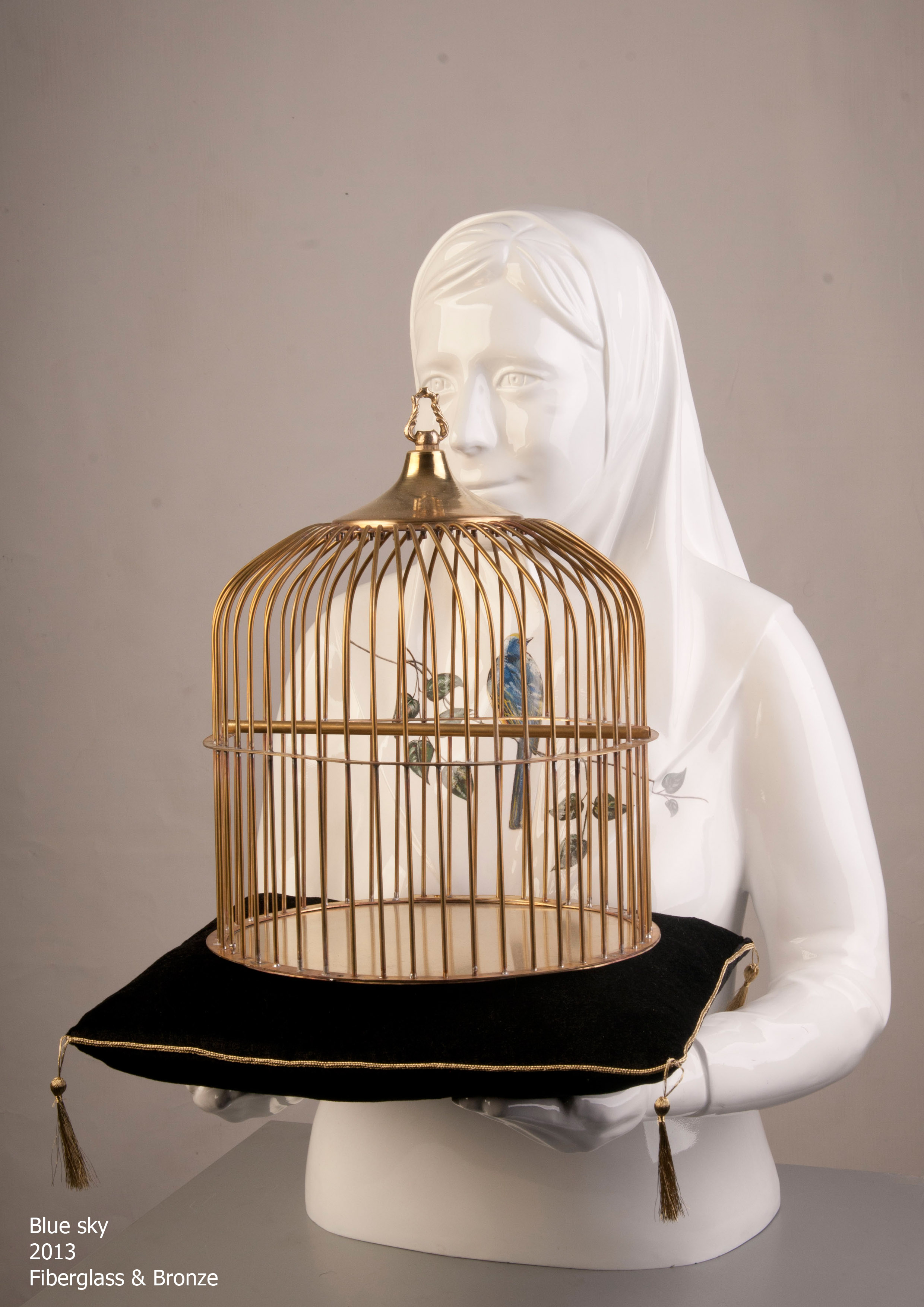 In the series titled Blue Skies, Sara presents us with her militant characters. All in Hijab, the Iranian uniform worn in the “outside” life. These almost life-size characters are made of porcelain, some painted with delicate floral blooms. And yet in their fragility, they bear gas masks in polished bronze. They all stand up right – at the ready. The clenched fists and body language tell us that despite the “handle with care” exterior, she is a force to be reckoned with. Persevering endurance is her game.
