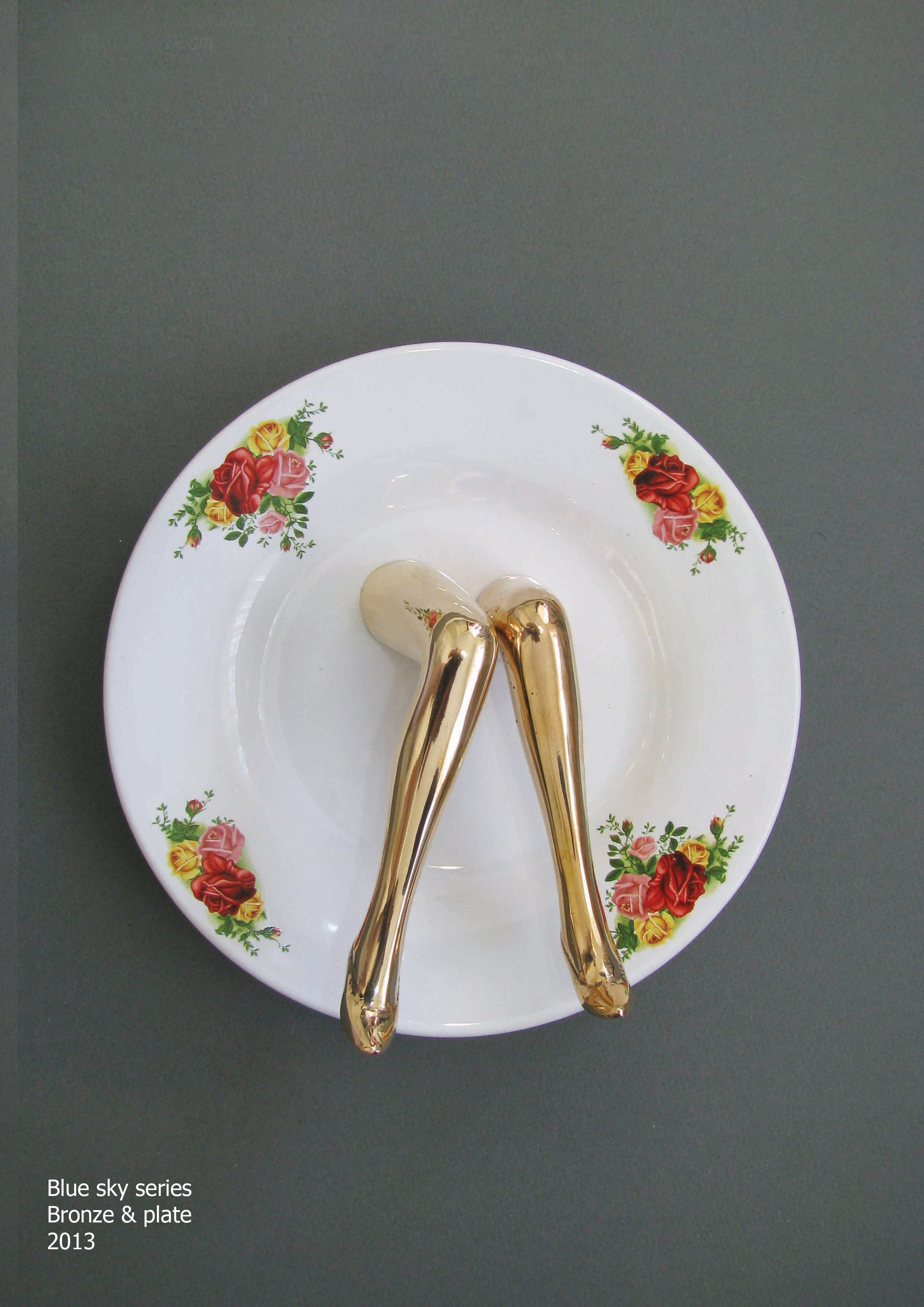 In her plate series, juxtaposing beautiful legs made out of bronze with nostalgic porcelain plates, Sara makes us question both the cliché of the nurturing, loving housewife-mother, always on hand to serve food on comforting china plates versus the other clichéd free-love, fun-loving woman with gorgeous legs and bubbly attitude. Both types are trapped in their own clichés. Neither the plates fit with the legs, nor the legs with the plates. In this beautiful series, Sara forces us to think of how society forces women into one type or another. A fun-loving sexy wife mother almost seems impossible.
