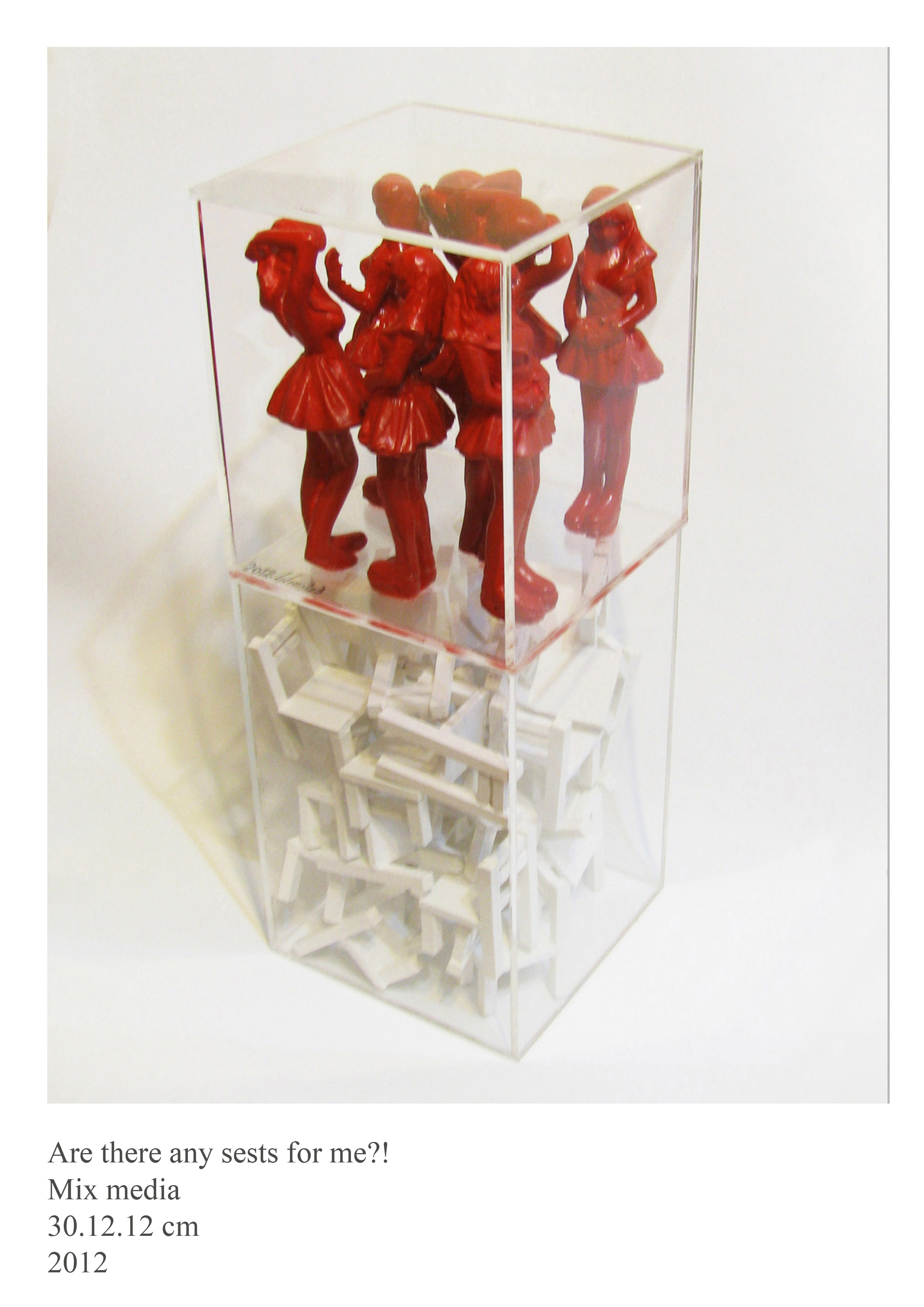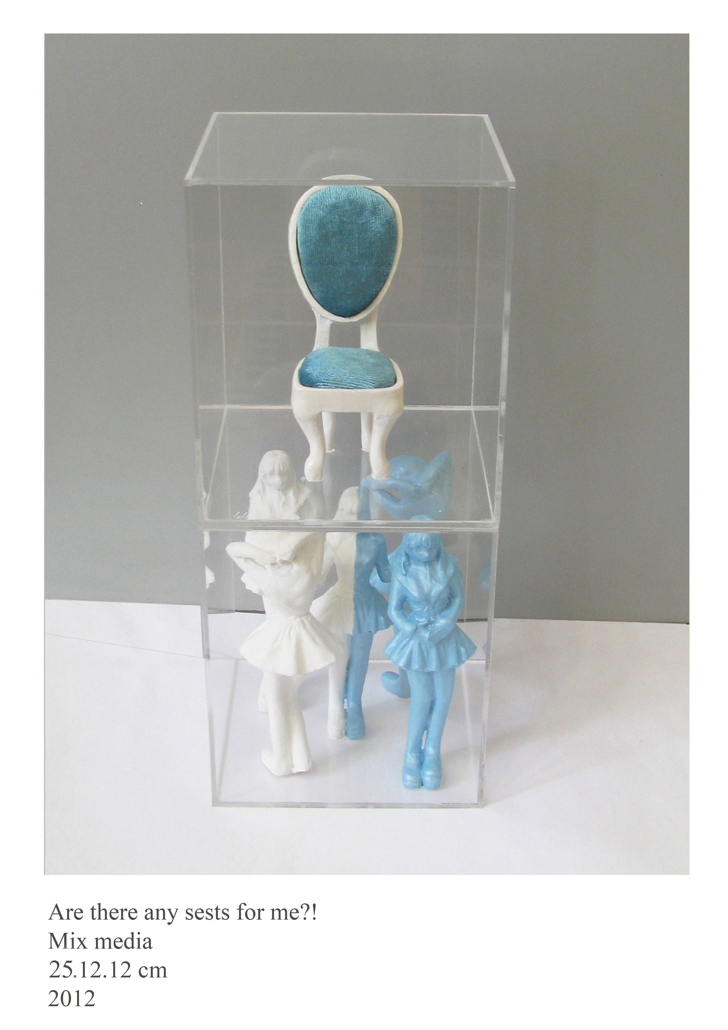 But despite the femininity of her miniature worlds, the little female figures look worryingly displaced. They are all actually trapped or seem suspended. The unfairness of it all is tear-jerking, they can see their chairs, but they can never sit.